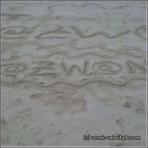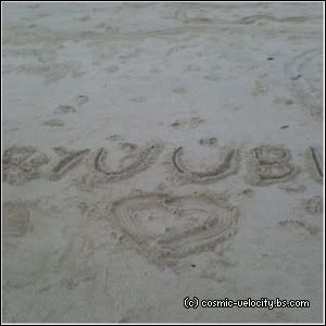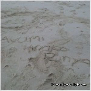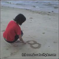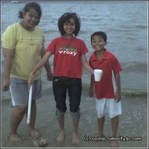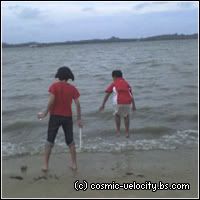 .. xD So we went with the hotdog-on-a-stick anyway cause otherwise I'd go mad. Then.. Pia came~! :D My big sis had to go to the Simei MRT Station to fetch her friends and my younger sis, Pia and I went to the beach with Aiman's family to pick a spot. Azwan (my P6 cousin, not my classmate) was there too and soon, Aziq's family arrived and we played a game of Monkey and it was fun! ^^ After setting up the food, tables and the picnic mat, my sister, Pia and I sat down and had a little chit-chat. I ate my grandma's delicious banana jemput-jemput and drank lychee syrup. Soon, everyone arrived! Except my sis. Then I asked my mom if we could play in the sand and she agreed! Yayyy! So the four of us went to the sandy beach. Azwan brought cups and plates to make sand castles. :3 We drew lots of things on the sand!
